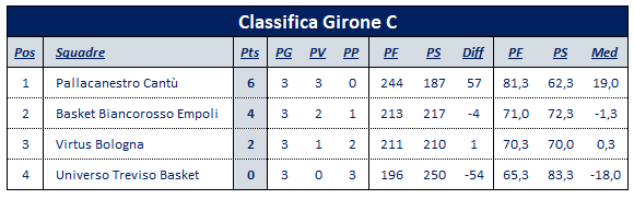 Treviso: Pivetta 15, Moreschetti 5, Beltrame 21, Mestriner 4, Erasmus, Prai 9, Panighel 8, Vescovo 8, Pavanello, Pavan, Bruniera 6, Santin 2. All. Sfriso